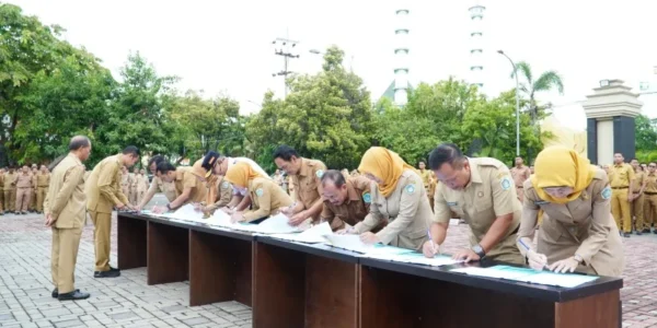 LAMONGAN, 13 Januari 2026 – Guna menguatkan pelaksanaan visi dan misi pembangunan daerah Kabupaten Lamongan, Bupati Lamongan Yuhronur Efendi bersama Pejabat Perangkat Daerah di Lamongan pada Senin (12/1/2026) melaksanakan Penandatanganan Perjanjian Kinerja Tahun 2026, di Halaman Pemerintah Daerah Lamongan. Ke depan…