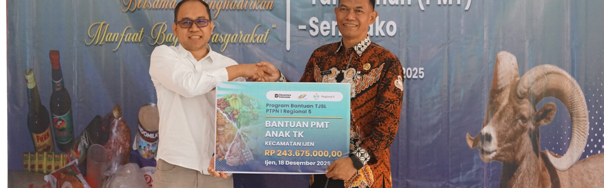 Penyerahan bantuan dilakukan oleh Kepala Bagian Corporate Secretary yang mewakili Region Head PTPN I Regional 5, R.I. Setiyobudi, kepada Camat Ijen, Wisnu Hartono, dengan total nilai TJSL sebesar Rp1,28 miliar.