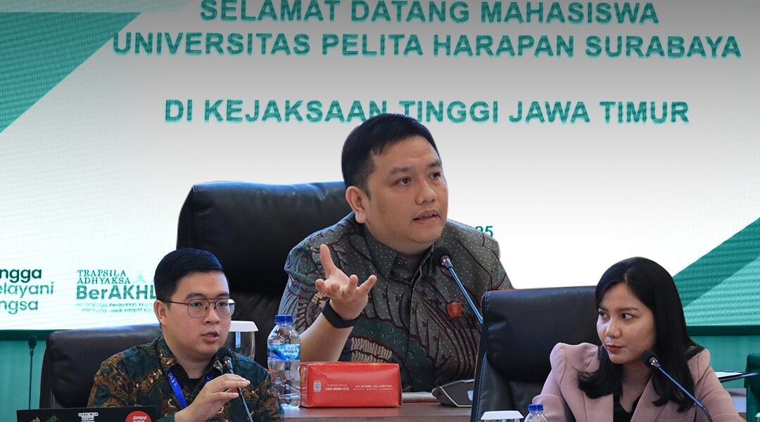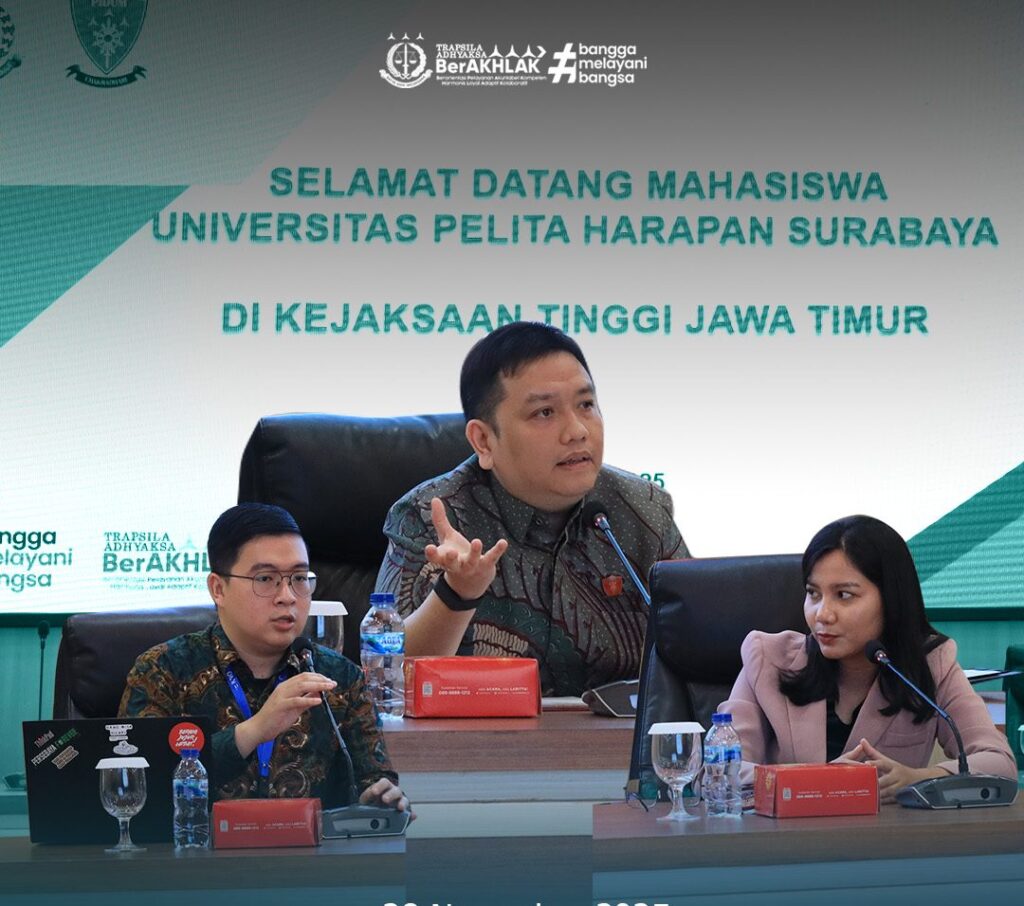 SURABAYA, Jumat 28 November 2025 – Kejaksaan Tinggi Jawa Timur menerima kunjungan lapangan (site visit) mahasiswa Program Studi Hukum Universitas Pelita Harapan (UPH) Surabaya yang berlangsung di Aula Sasana Adhyaksa, Jumat (28/11/2025). Sebanyak 40 mahasiswa hadir dalam kegiatan ini dengan didampingi oleh dua dosen pengajar.