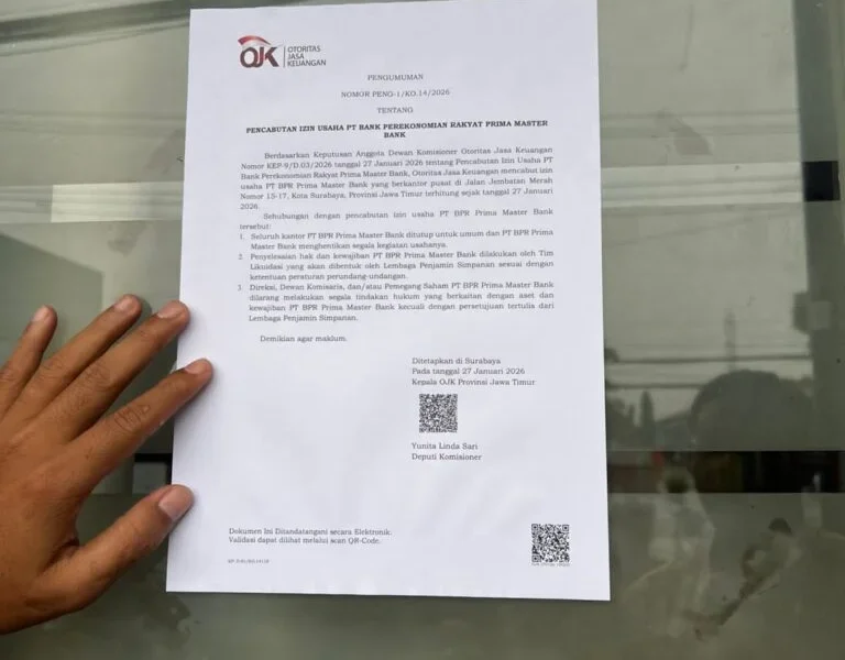 SURABAYA, 27 JANUARI 2026 — Otoritas Jasa Keuangan (OJK) resmi mencabut izin usaha PT Bank Perekonomian Rakyat (BPR) Prima Master Bank yang beroperasi di Jalan Jembatan Merah No. 15–17, Kota Surabaya, Jawa Timur. Keputusan ini tertuang dalam Keputusan Anggota Dewan Komisioner OJK Nomor KEP-9/D.03/2026 tertanggal 27 Januari 2026.