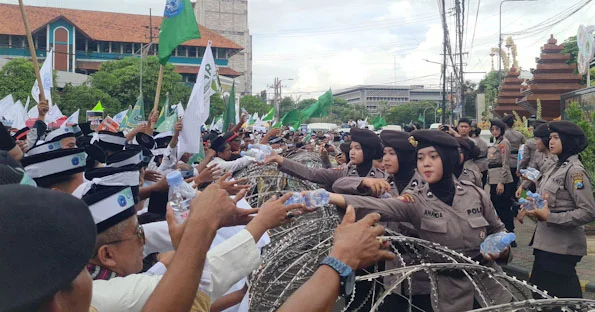 Sebagai bentuk pendekatan empati kepada massa aksi, tim negosiator dari barisan Polwan juga membagikan air minum kepada peserta aksi.