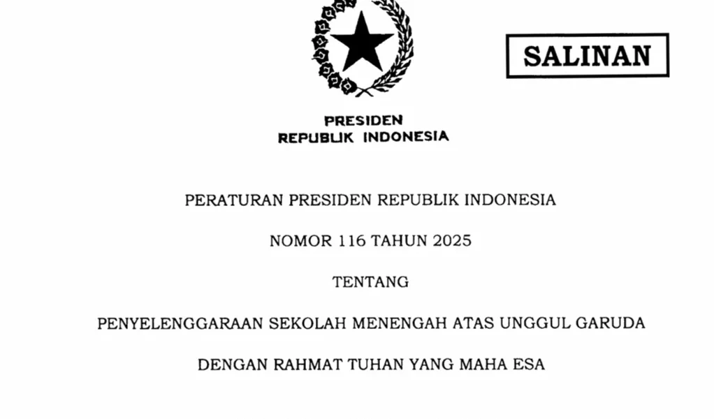 JAKARTA, 20 FEBRUARI 2026 — Pemerintah resmi menetapkan Peraturan Presiden (Perpres) Nomor 116 Tahun 2025 tentang Penyelenggaraan Sekolah Menengah Atas (SMA) Unggul Garuda. Regulasi ini ditandatangani Presiden Republik Indonesia Prabowo Subianto pada 20 November 2025 sebagai langkah strategis memperkuat kualitas pendidikan nasional dan menyiapkan sumber daya manusia unggul.
