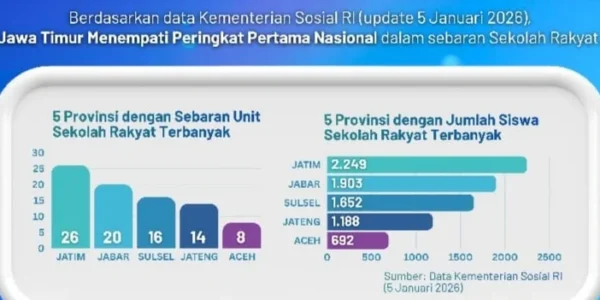 SURABAYA, 13 JANUARI 2026 – Provinsi Jawa Timur tercatat sebagai daerah dengan jumlah Sekolah Rakyat (SR) terbanyak di Indonesia. Dari total 166 titik Sekolah Rakyat yang diresmikan Presiden RI Prabowo Subianto, sebanyak 26 titik berada di Jawa Timur dan seluruhnya telah…