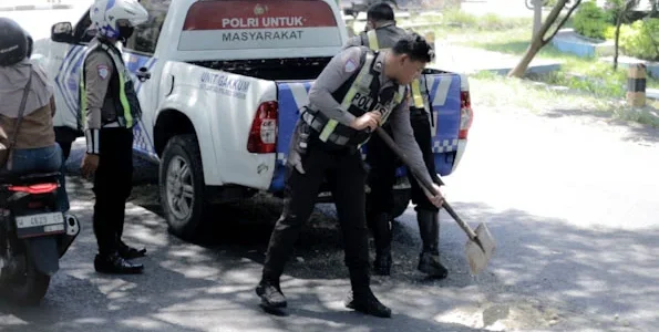 Demi Keselamatan Pengendara, Polantas Polres Gresik Tambal Jalan Berlubang