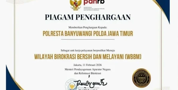 Banyuwangi, 14 Februari 2026– Polresta Banyuwangi Polda Jawa Timur kembali menorehkan sejarah dengan meraih penghargaan Zona Integritas (ZI) Menuju Wilayah Birokrasi Bersih dan Melayani (WBBM) Tahun 2025, Kamis (11/2/2026) Penghargaan ini menjadi bukti nyata komitmen, integritas, dan kerja keras seluruh personel…